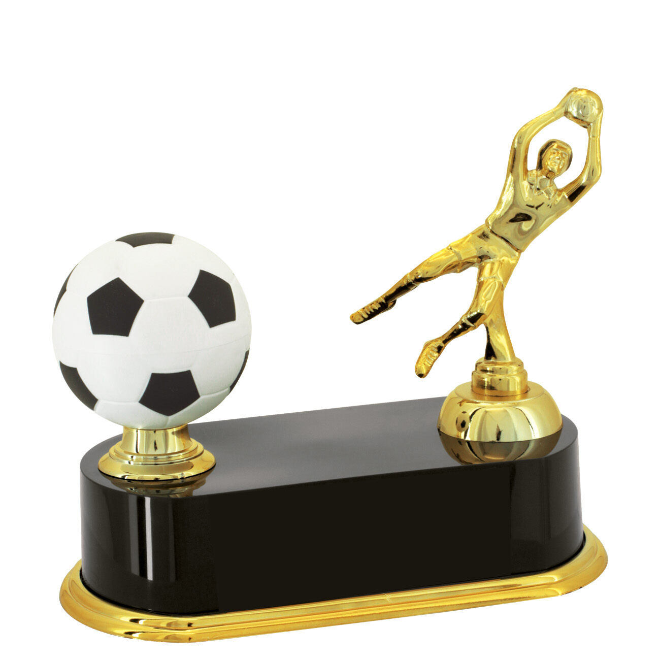 Troféu em polímero metalizado a alto vácuo medidas : altura – 19 cm. Largura superior – 22,50 cm. Largura inferior –22,50 cm. Altura da base- 5,6 cm. Peso aproximado – 850 grcores – dourado, preto, branco composição:c omponentes fabricados em polímero: base oval, suportes,estatuetas fixas de bola e goleiro de futebol.outros componentes: ferragens para fixação