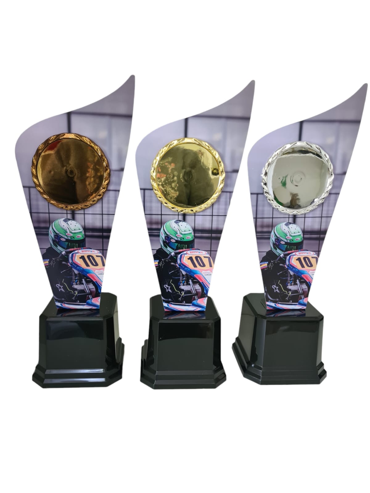 Troféu em polímero, com chapa de metal estampada medidas: altura – 40 cm. Largura superior – 13,70 cm. Largura inferior – 12,10 cm. Altura da base- 9,10 cm. Peso aproximado – 1,20 kg cores – dourado, preto, estampa alusiva a modalidade composição: componentes fabricados em polímero: base oitavada, ramo para colagem de adesivo. Outros componentes: ferragens para fixação, chapa de metal estampadatr