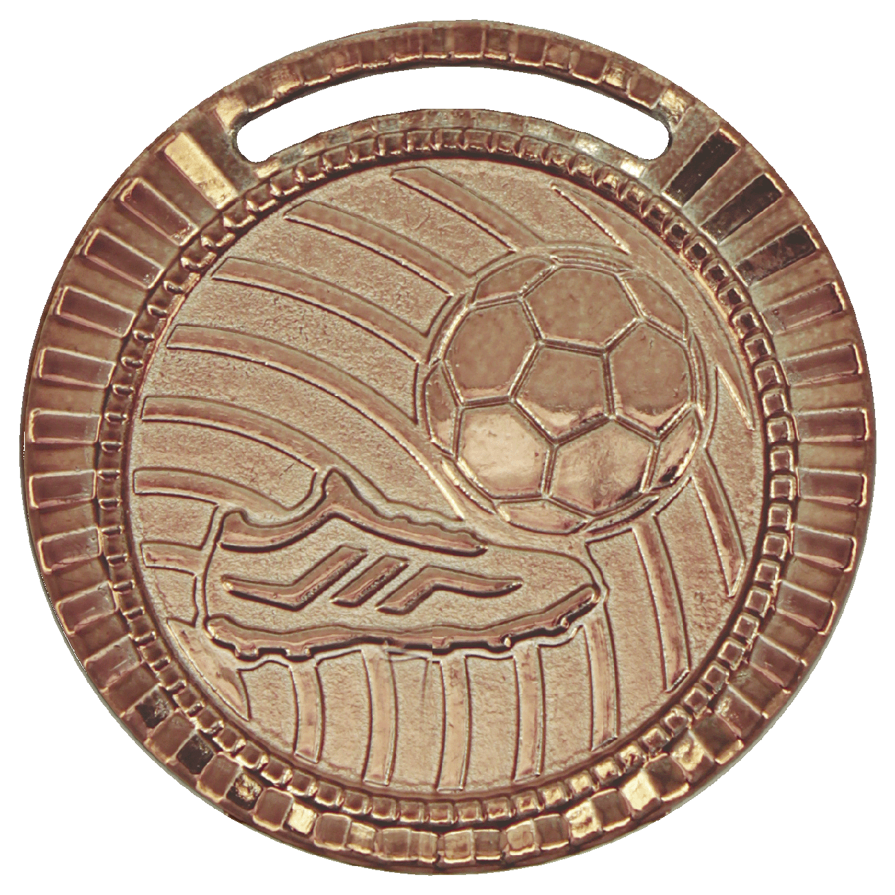 Medalha redonda fundida em liga metálica de zamac, com 55 mm de diâmetro, com figura em alto relevo no formato chuteira e bola de futebol e com detalhes raiados na borda em alto relevo. Espessura máxima de 2,5 mm. Metalizada a alto vácuo e pintada na cor bronze Suporte para fita com 2,5 cm de largura. A medalha pode vir acompanhada de fita de cetim nas cores azul, vermelha, amarela, branca ou verde com 2,5 cm de largura