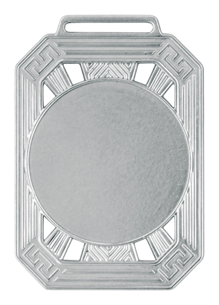Medalha retangular com as medidas de 85 mm X 60 mm,
