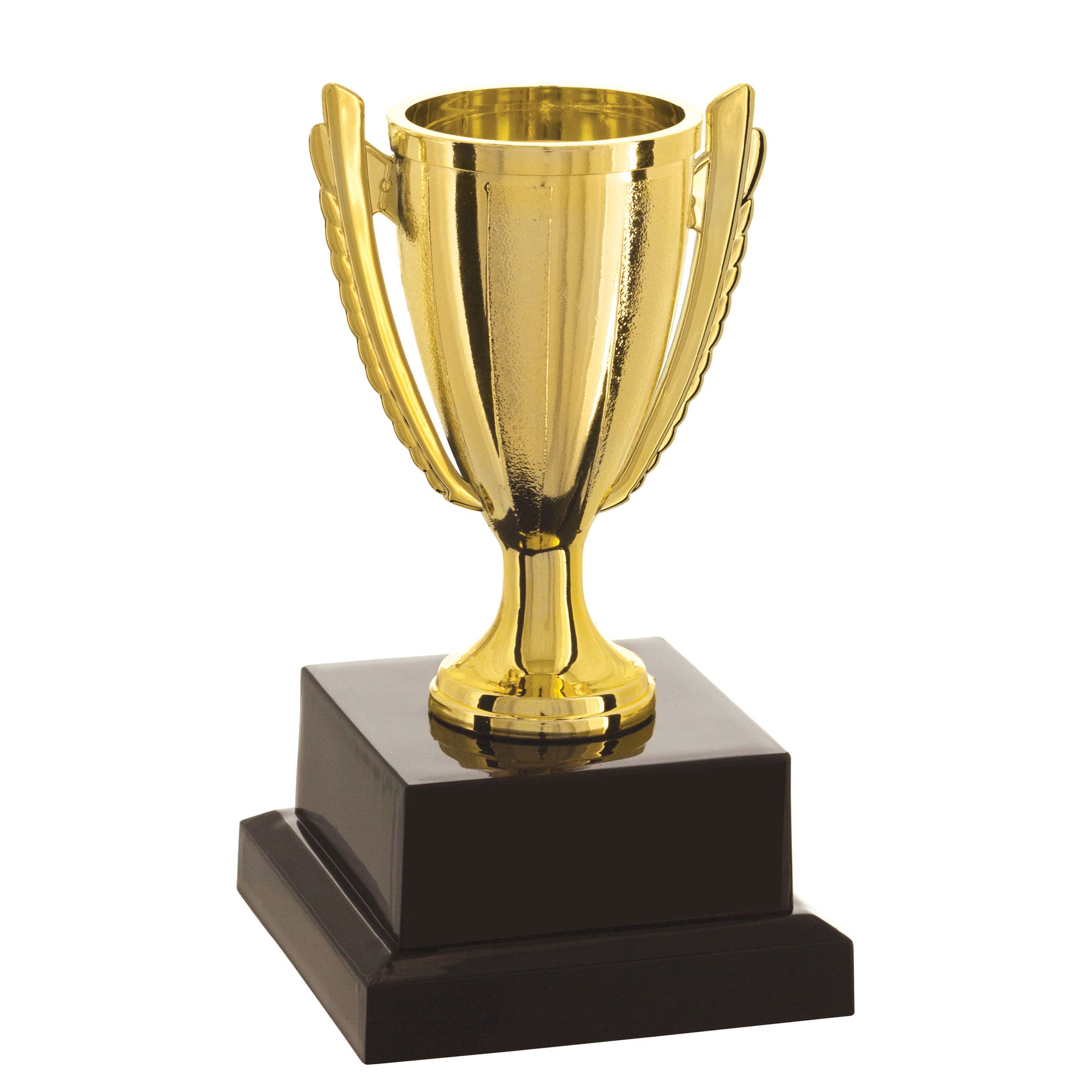 Troféu em polímero metalizado a alto vácuo medidas: altura – 14 cm. Largura superior – 7,10 cm. Largura inferior – 7,50 cm. Altura da base- 3,60 cm. Peso aproximado – 200 gr cores – dourado, preto cores alternativas: taça com alças nas cores dourado ou prata. Composição: componentes fabricados em polímero: base quadrada, taça com alças. Outros componentes: ferragens para fixação