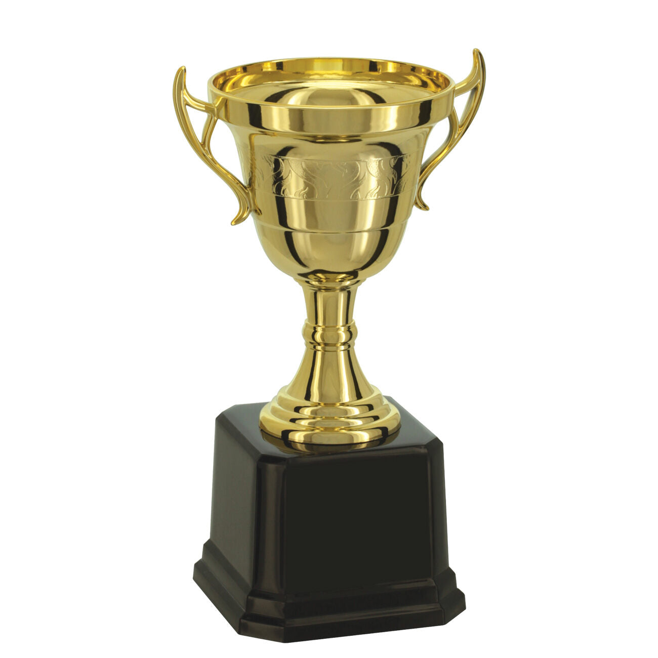 Troféu em polímero metalizado a alto vácuo medidas: altura – 18 cm. Largura superior – 10,50 cm. Largura inferior –7,80 cm. Altura da base- 5,70 cm. Peso aproximado – 250 grcores – dourado, preto cores alternativas: cone, taça com alças nas cores dourado ou prata. composição: componentes fabricados em polímero: base oitavada, cone, taça com alças e pintura interna. outros componentes: ferragens para fixação