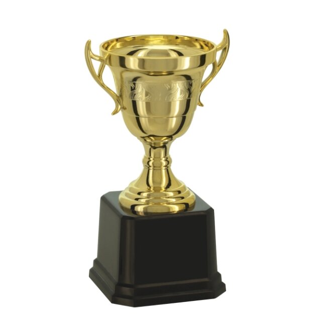 Troféu em polímero metalizado a alto vácuomedidas:altura – 15 cm. Largura superior – 9 cm. Largura inferior – 7,30cm. Altura da base- 5 cm. Peso aproximado – 200 grcores – dourado, pretocores alternativas: cone, taça com alças nas cores douradoou prata.composição:componentes fabricados em polímero: base oitavada, cone,taça com alças e pintura interna.outros componentes: ferragens para fixação