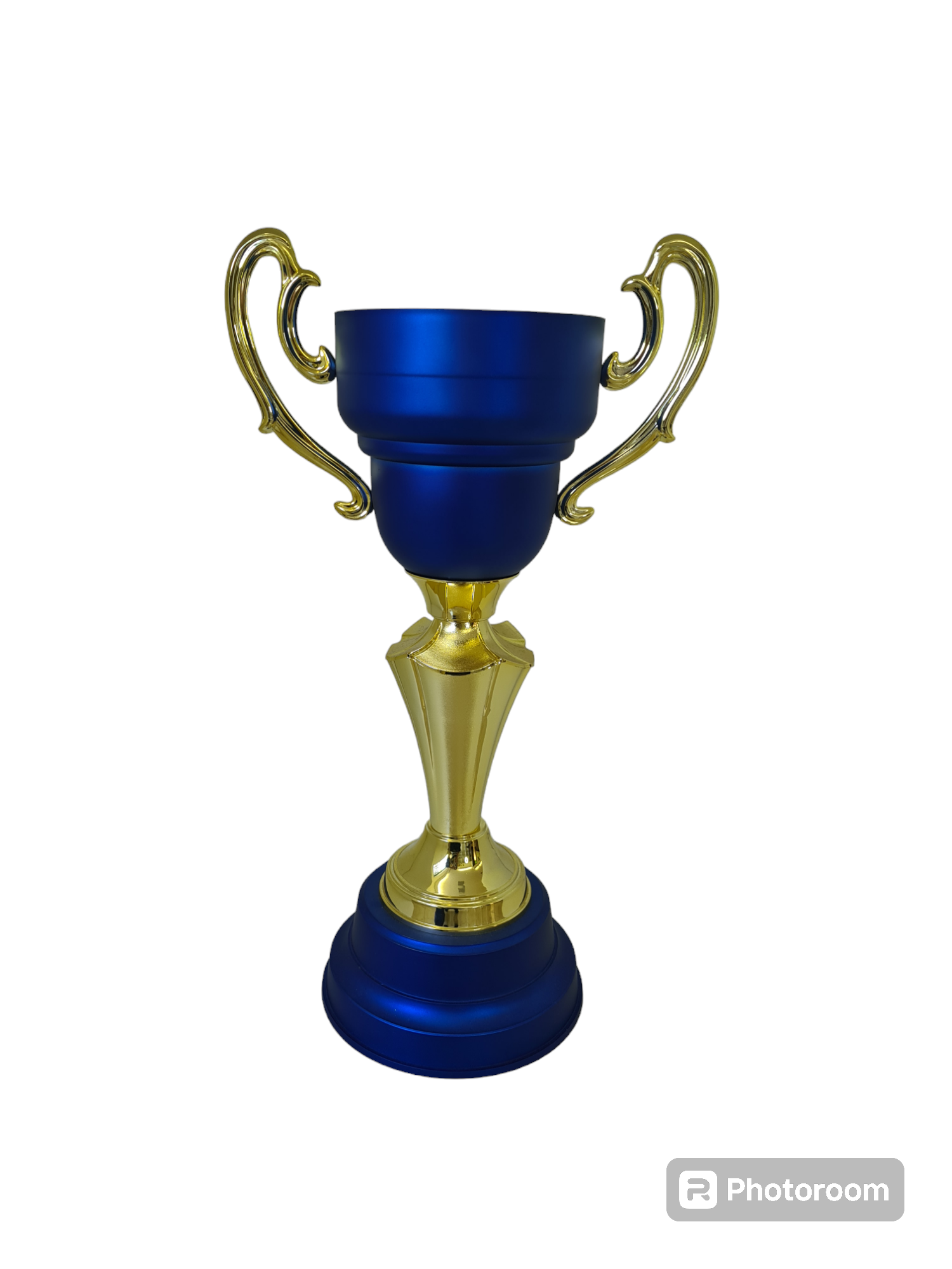 Troféu em polímero metalizado a alto vácuo medidas: altura – 56 cm. Largura superior – 33 cm. Largura inferior – 20,80 cm. Altura da base- 8,50 cm. Peso aproximado – cores- dourado, azul. composição: componentes fabricados em polímero: base redonda, suportes, cone, tampa, taça com alça e pintura interna. Outros componentes: ferragens para fixação