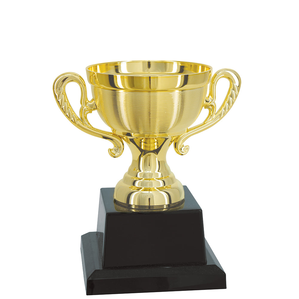 Troféu em polímero metalizado a alto vácuo medidas: altura - 17 cm. Largura superior – 15,50 cm. Largura inferior – 11 cm. Altura da base- 8,30 cm. Peso aproximado –kg cores- dourado e preto. Composição: componentes fabricados em polímero: base quadrada, suporte, taça com alças. Outros componentes: ferragens para fixação.