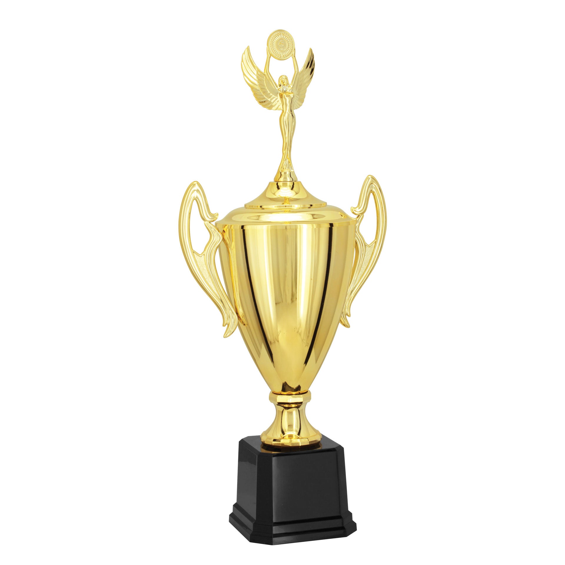 Troféu em polímero metalizado a alto vácuo medidas: altura – 64 cm. Largura superior – 29 cm. Largura inferior – 14,50 cm. Altura da base- 11 cm. Peso aproximado – cores – dourado, preto cores alternativas: suporte, taça com alças e tampa, estatueta superior na cor prata. Composição: componentes fabricados em polímero: base oitavada, suporte, taça com alças e tampa, estatueta superior. Outros componentes: ferragens para fixação.