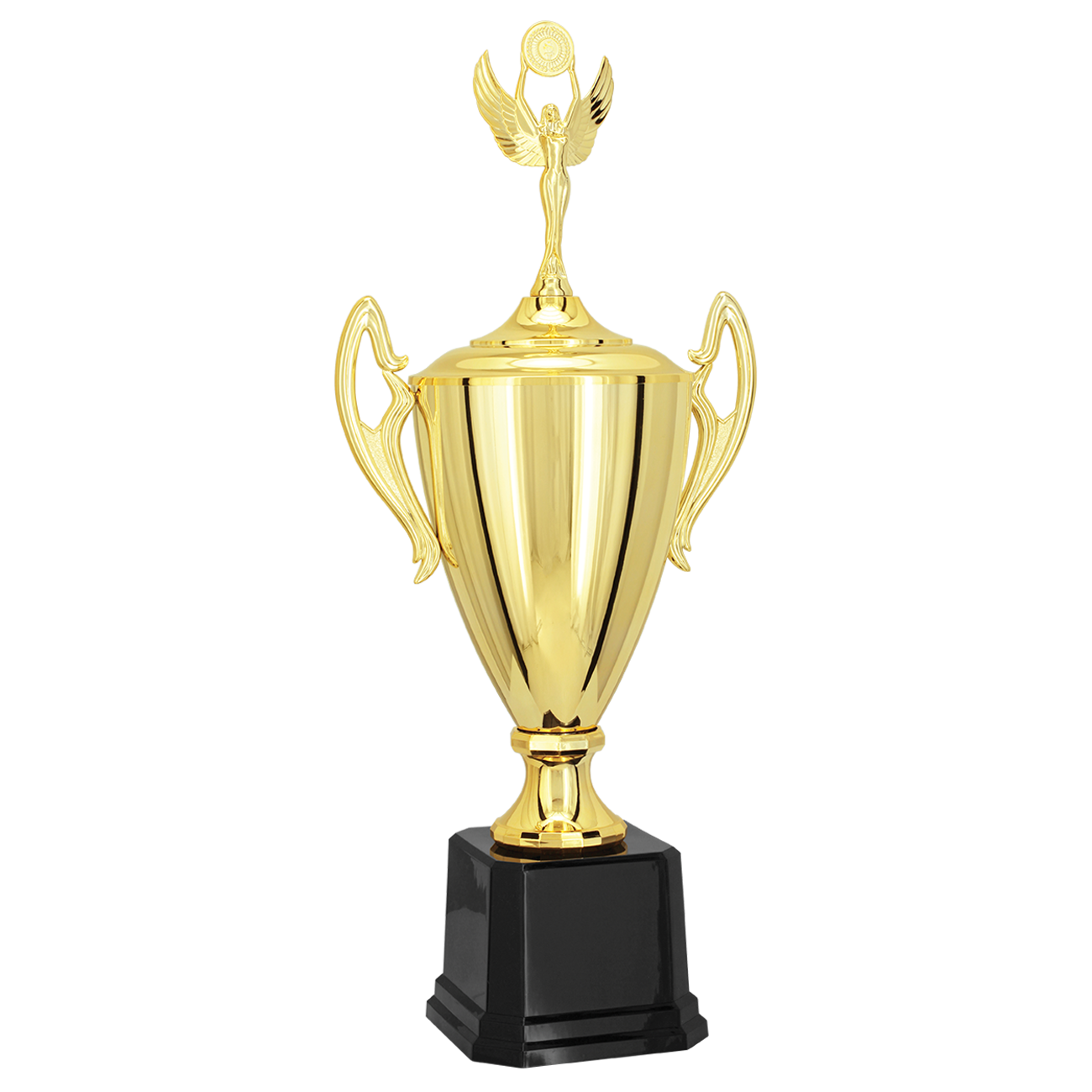 Troféu em polímero metalizado a alto vácuo medidas: altura – 72 cm. Largura superior – 31 cm. Largura inferior – 17,80 cm. Altura da base- 13,40 cm. Peso aproximado – cores – dourado, preto cores alternativas: suporte, taça com alças e tampa, estatueta superior na cor prata. Composição: componentes fabricados em polímero: base oitavada, suporte, taça com alças e tampa, estatueta superior. Outros componentes: ferragens para fixação.