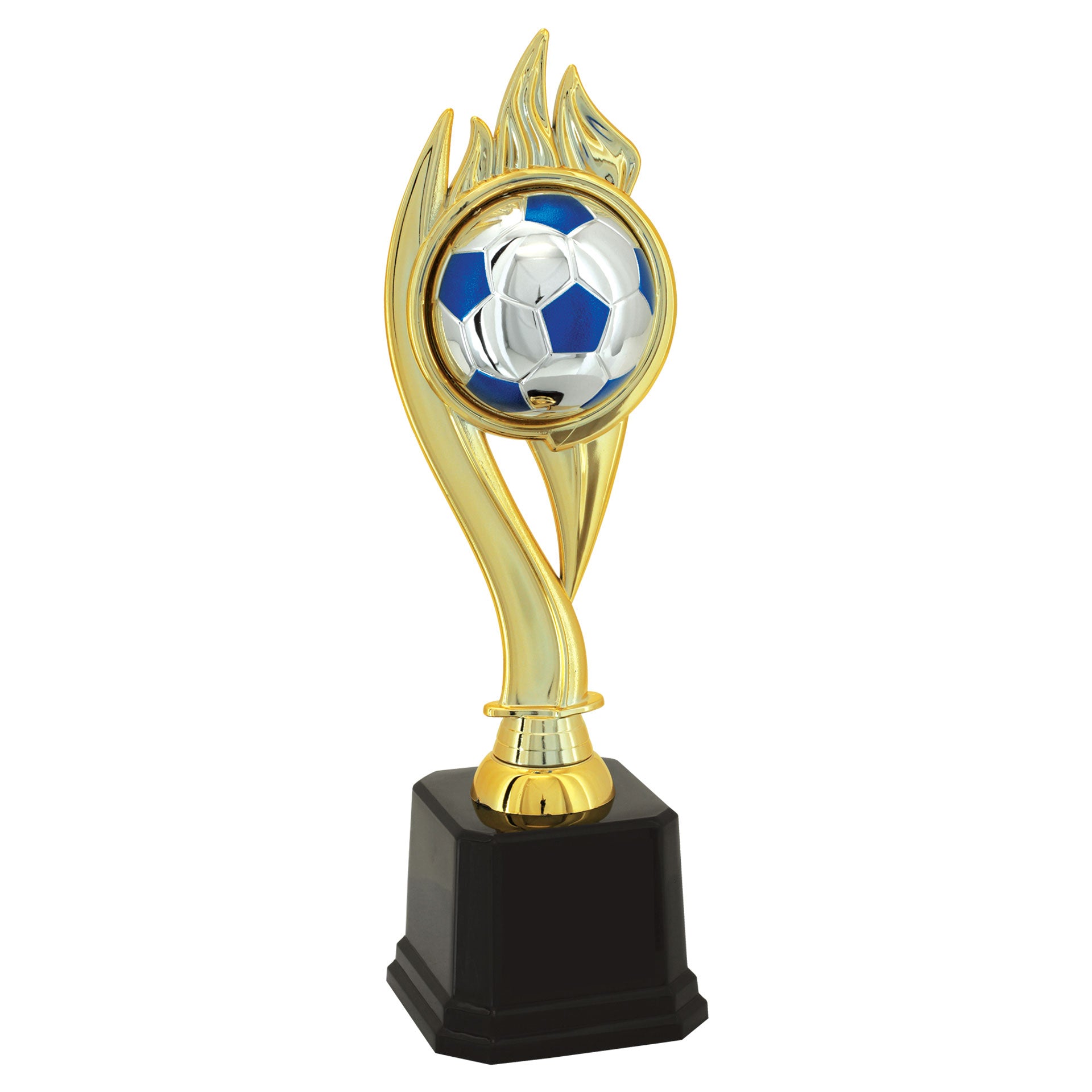 Troféu em polímero metalizado a alto vácuo medidas: altura – 34 cm. Largura superior – 10 cm. Largura inferior – 10,10 cm. Altura da base- 7,50 cm. Peso aproximado – 650 gr cor dourado estatueta de meia bola de futebol nas cores prata, com gomos nas cores azul composição: componentes fabricados em polímero: base oitavada, estatueta superior de chama com meia bola de futebol. Outros componentes: ferragens para fixação.