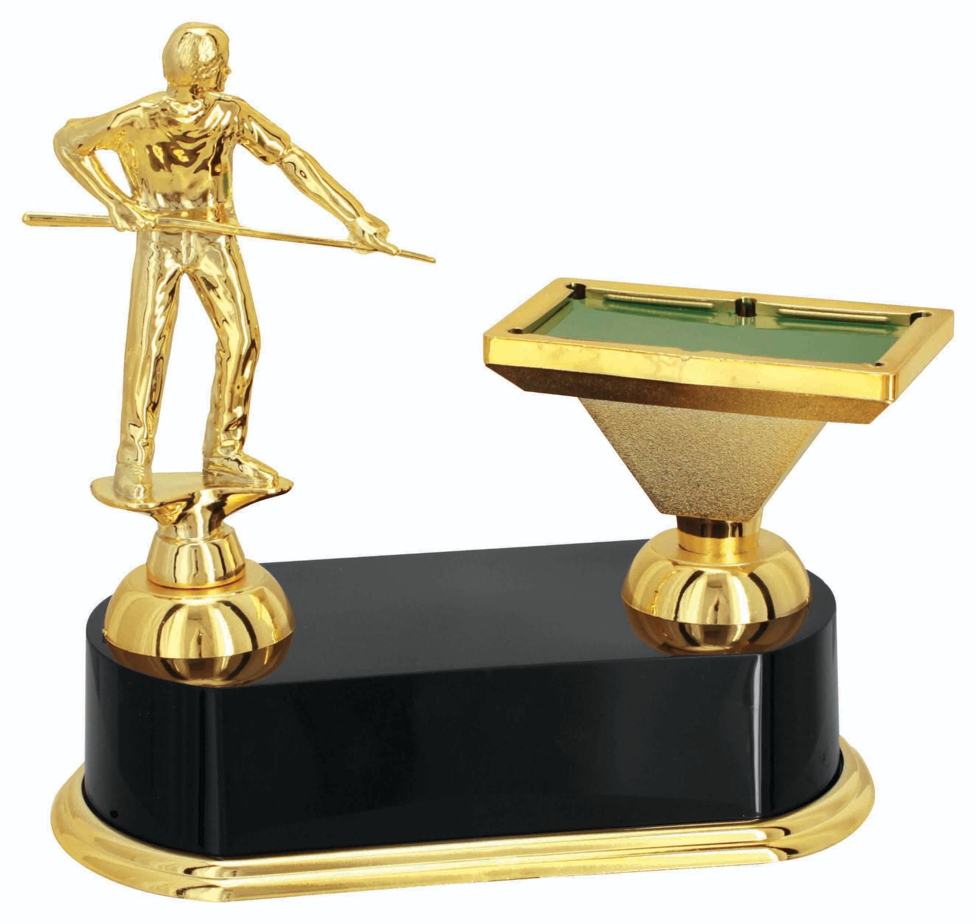 Troféu em polímero metalizado a alto vácuo medidas: altura – 22 cm. Largura superior – 24 cm. Largura inferior – 22,50 cm. Altura da base- 5,6 cm. Peso aproximado – cores – dourado, preto, verde composição: componentes fabricados em polímero: base oval, suportes, estatueta fixa de jogador de sinuca, estatueta fixa de mesa de sinuca. Outros componentes: ferragens para fixação.