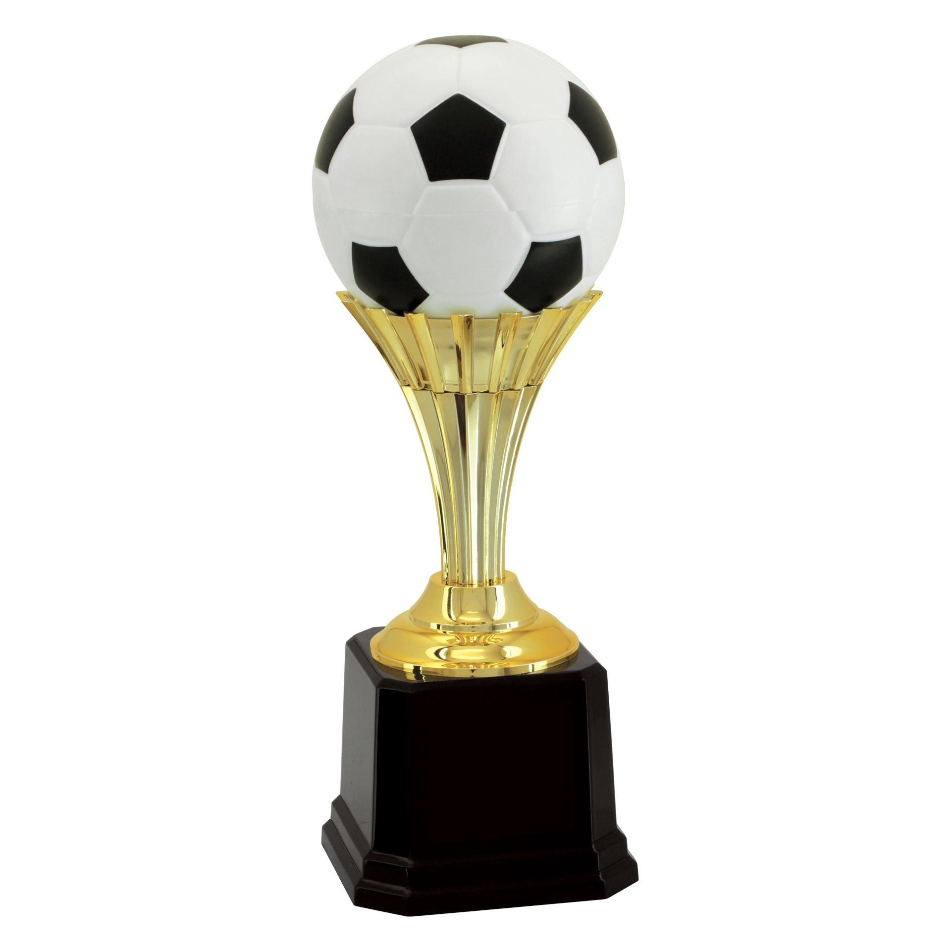 Troféu em polímero metalizado a alto vácuo medidas: altura – 29 cm. Largura superior – 10,50 cm. Largura inferior – 10,10 cm. Altura da base- 7,50 cm. Peso aproximado – 700 gr cores – dourado, preto, branco composição: componentes fabricados em polímero: base oitavada, suporte, cone com frisos, coroa com dezesseis pontas, estatueta fixa de bola de futebol. Outros componentes: ferragens para fixação