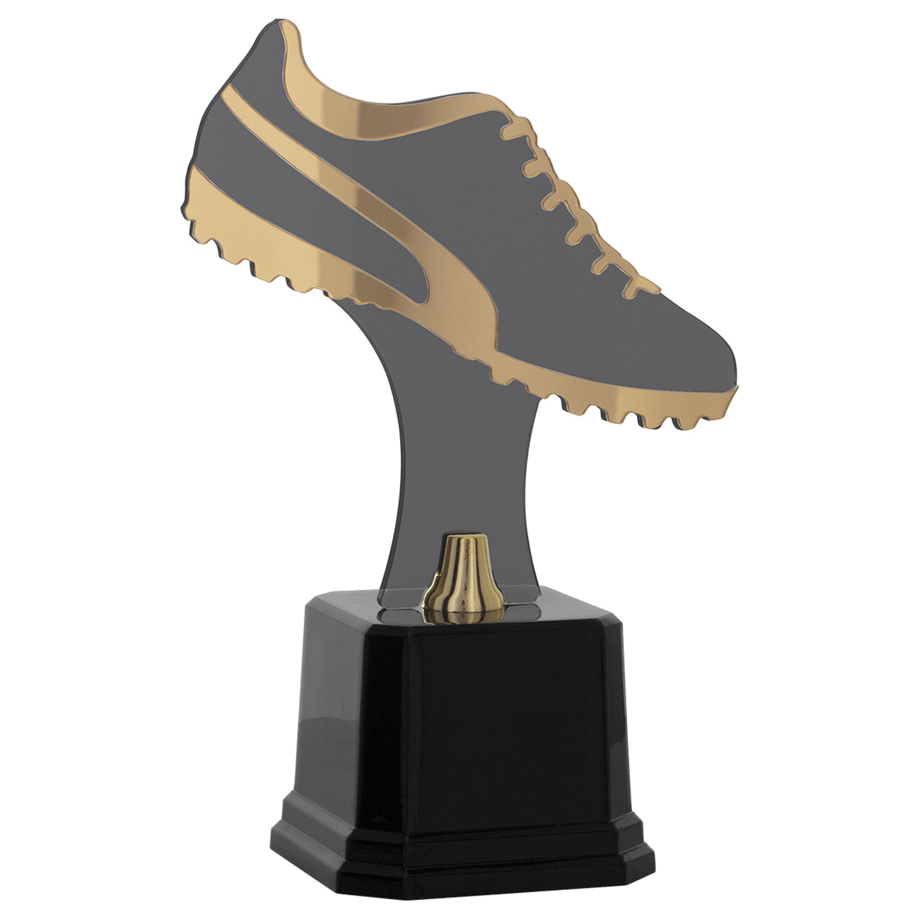 Troféu em polímero com placa de acrílico medidas: altura – 26 cm. Largura superior – 18 cm. Largura inferior – 10,10 cm. Altura da base- 7,50 cm. Peso aproximado – cores – dourado, preto, fumê. Composição: componentes fabricados em polímero: base oitavada, placa de acrilico cortada a laser em formato de chuteira de futebol society, aplique de acrílico dourado. Outros componentes: ferragens para fixação, fixador de placa fabricado em zamac