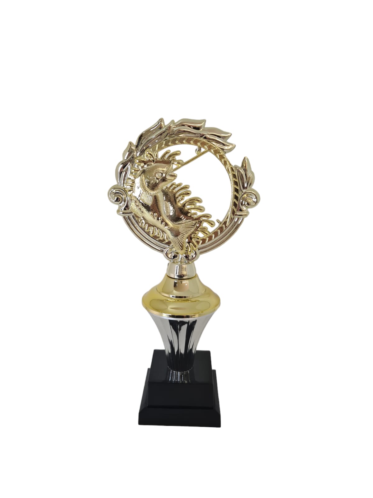 Troféu em polímero metalizado a alto vácuo medidas: altura – 26 cm. Largura superior – 7 cm. Largura inferior – 7,50 cm. Altura da base- 3,6 cm. Peso aproximado – 210 gr cores – dourado, preto, prata composição: componentes fabricados em polímero: base quadrada, cone com frisos e tampa, estatueta superior. Outros componentes: ferragens para fixação