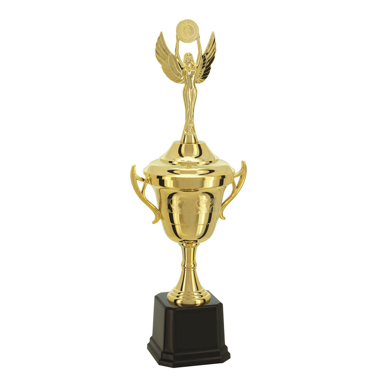altura – 45 cm. largura superior – 16 cm. largura inferior – 10,10 cm. altura da base- 7,50 cm. peso aproximado – 700 gr cores – dourado, preto cores alternativas: cone, taça com alças, tampa e estatueta superior nas cores dourado ou prata.